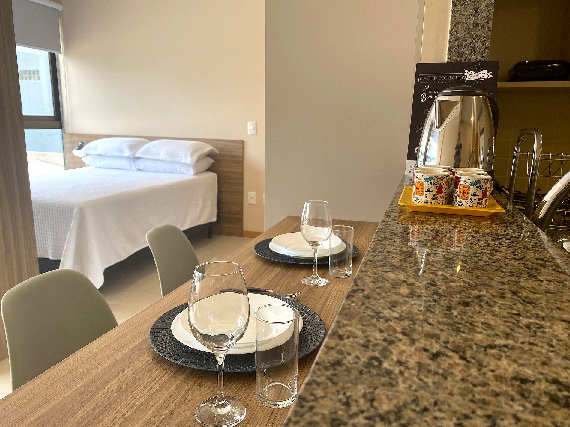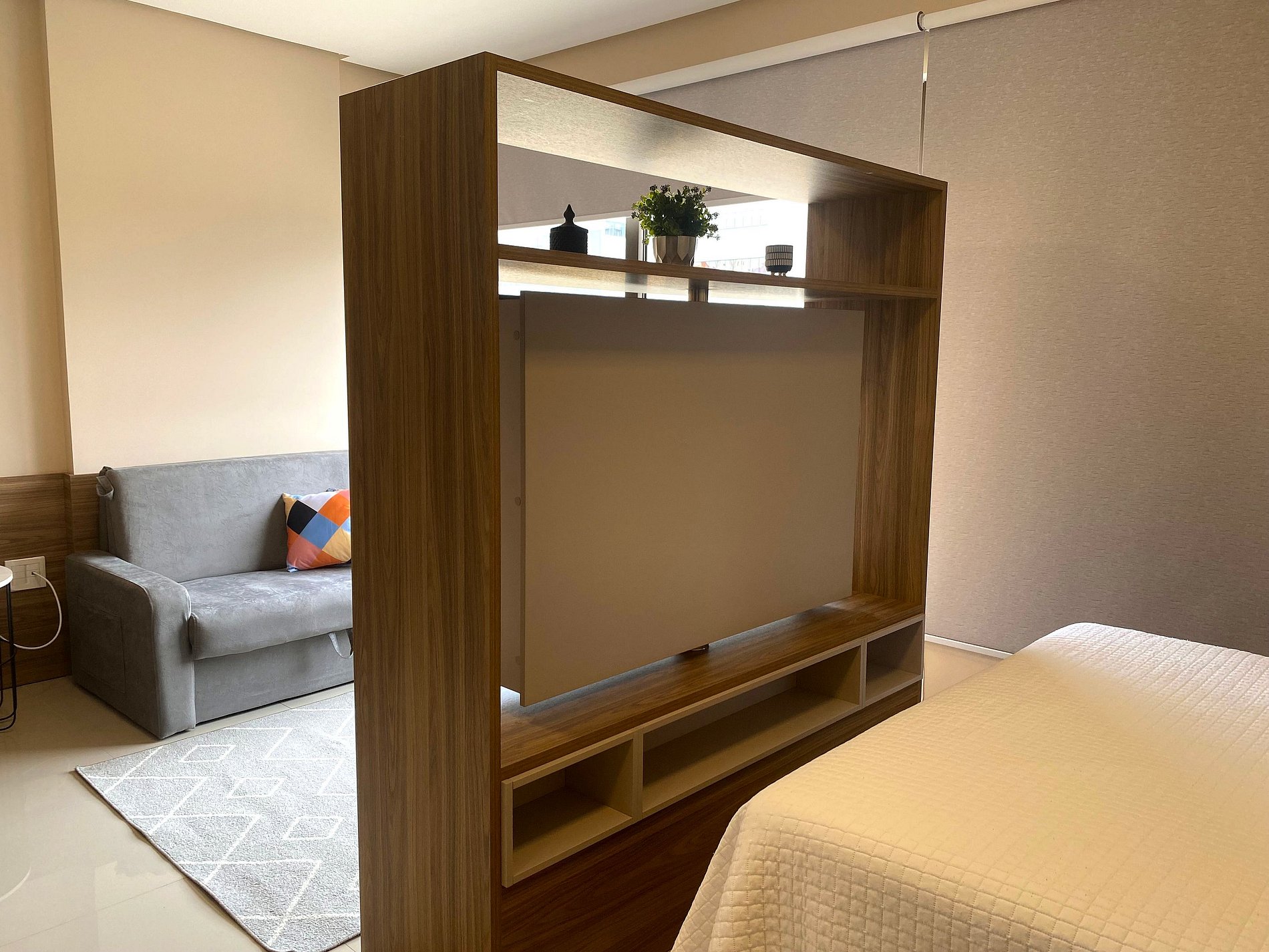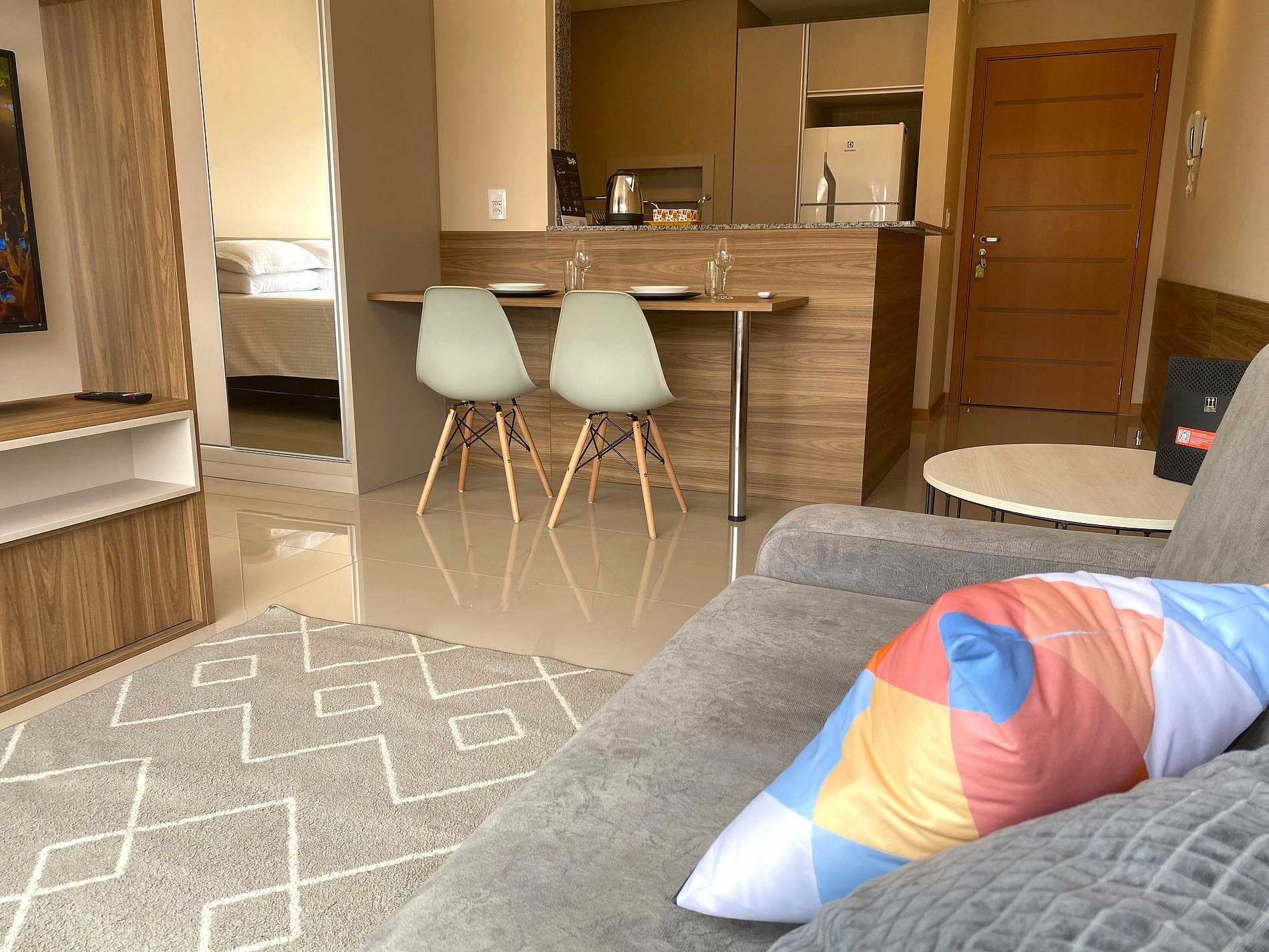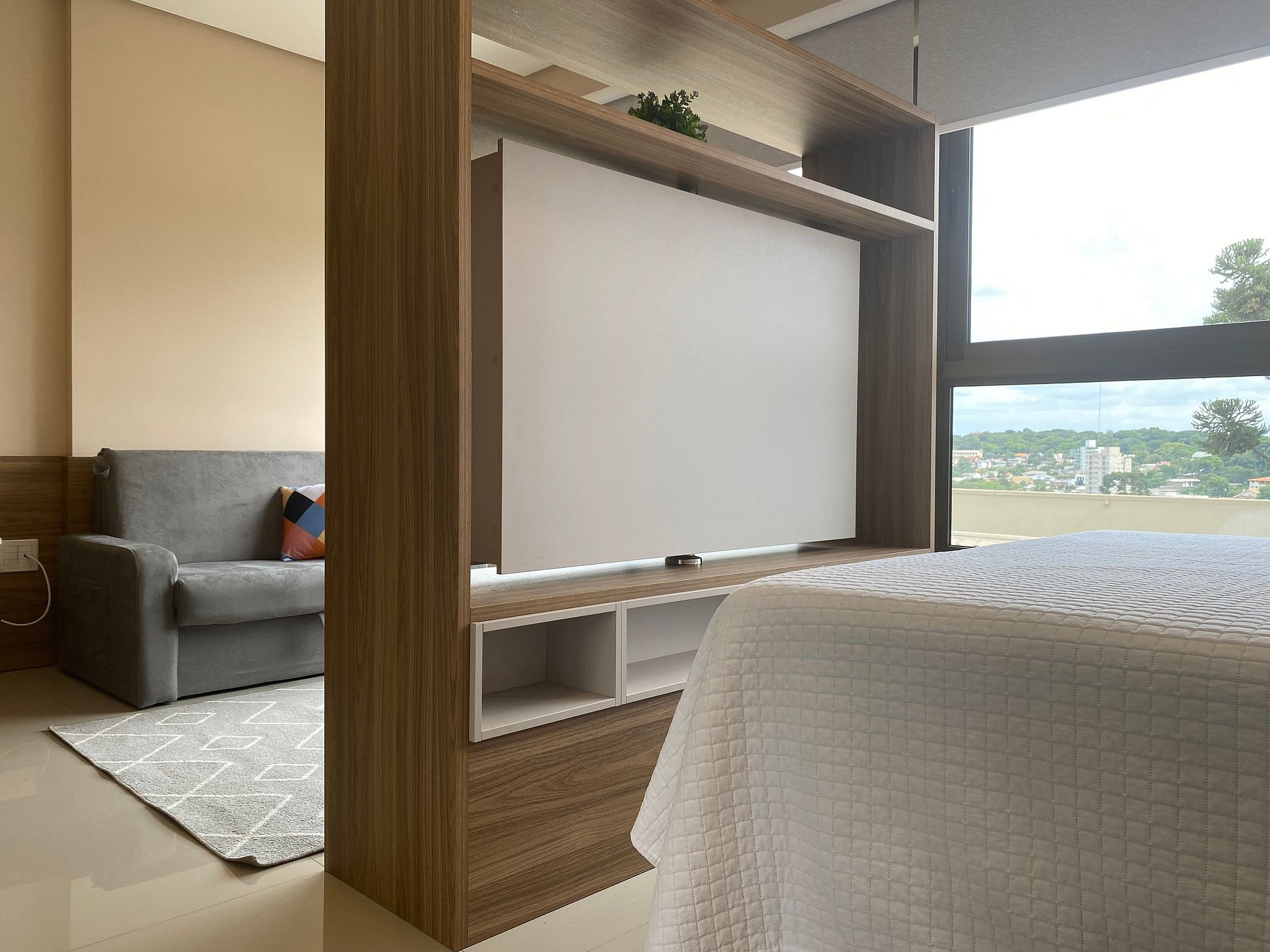 Aconchegante loft composto por um dormitório com cama box de casal e estar com sofá-cama. TV Smart com painel giratório. Wi-Fi em toda a propriedade. Fica no 2º andar, iluminado e arejado. Possui todos os utensílios para cozinha e churrasqueira. Disponibiliza roupas de cama, banho e guarda-roupa. O edifício possui elevador. Esse apartamento faz parte da MASTER COLLECTION, que reúne os melhores imóveis de hospedagem em Passo Fundo.